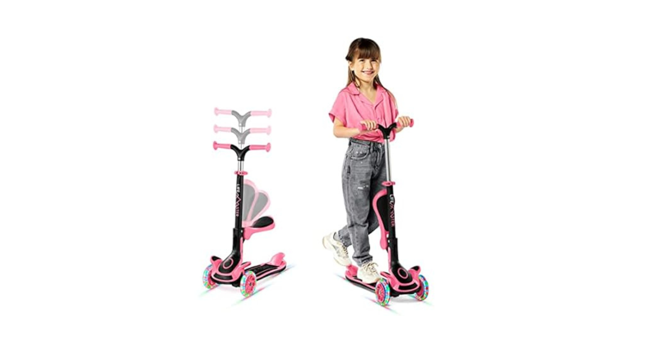 Give your child a ride they’ll never forget with this versatile 3-Wheel Kids Scooter with Foldable Seat—a fun-packed, parent-approved scooter that grows with your little one. Designed for toddlers and young kids ages 2 and up, it features an adjustable handlebar with three height settings to keep up with every growth spurt. Whether they’re just starting out or already zooming with confidence, the intuitive lean-to-steer technology helps them turn and glide with ease, promoting balance and coordination from day one. This sit-or-stand 3 wheel scooter transforms in seconds, thanks to a fold-out comfort seat with footrest that’s perfect for younger riders. As they grow, simply remove the seat for classic scooting fun. The deck is wide and anti-slip for safe footing, while the rear foot brake ensures smooth, reliable stops. Premium polyurethane wheels and ABEC-style bearings offer a super-smooth ride across sidewalks, driveways, and indoor floors—plus, the wheels light up with multi-color LEDs for a magical glow wherever they roll. Weighing in as lightweight and foldable, this toddler scooter is easy to carry, store, and travel with—ideal for families on the move. Crafted with durable aluminum and engineered polypropylene, it’s built to last through years of active play and supports up to 110 lbs (44 lbs when seated). With quick, tool-free assembly and a design made for everyday adventure, this scooter delivers non-stop smiles, indoors or out.