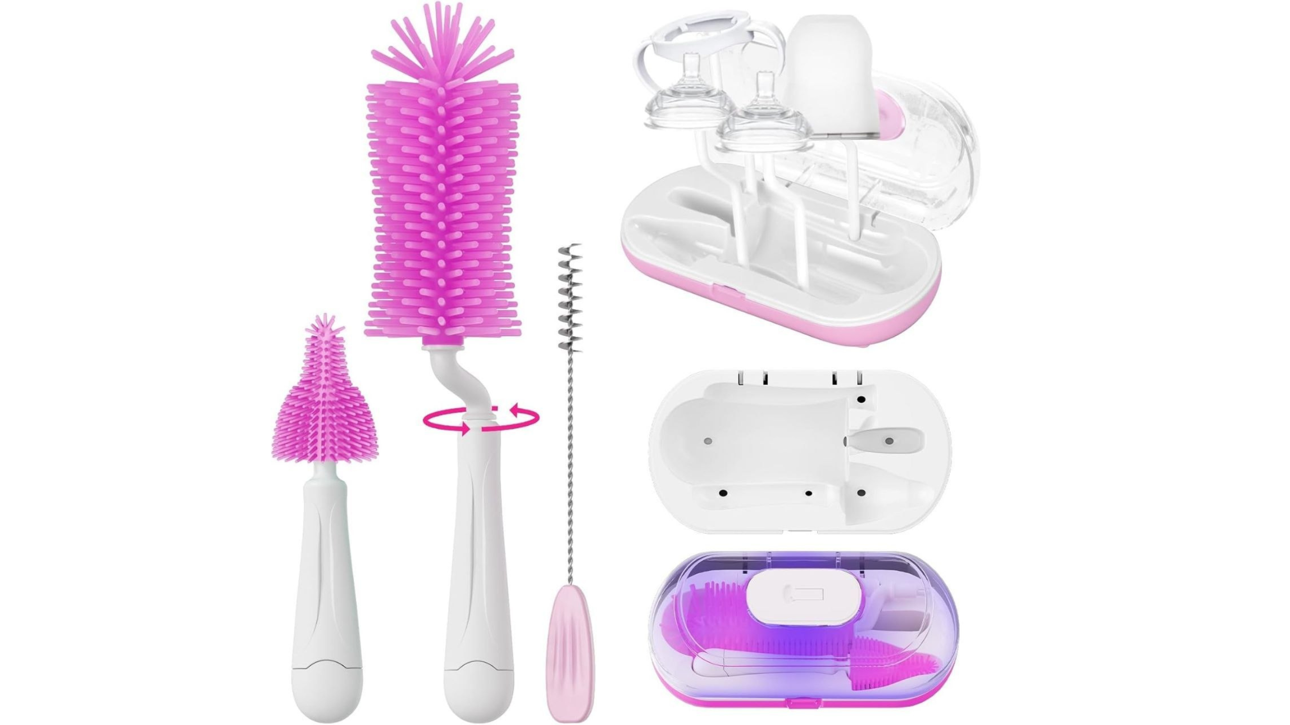 Bottle Brush Set with Drying Rack,Travel Bottle Cleaner Kit with Baby Bottle Brush,Straw Cleaner Brush,Nipple Brush-Baby Travel Essentials for Flying (Purple, Box-Shaped)