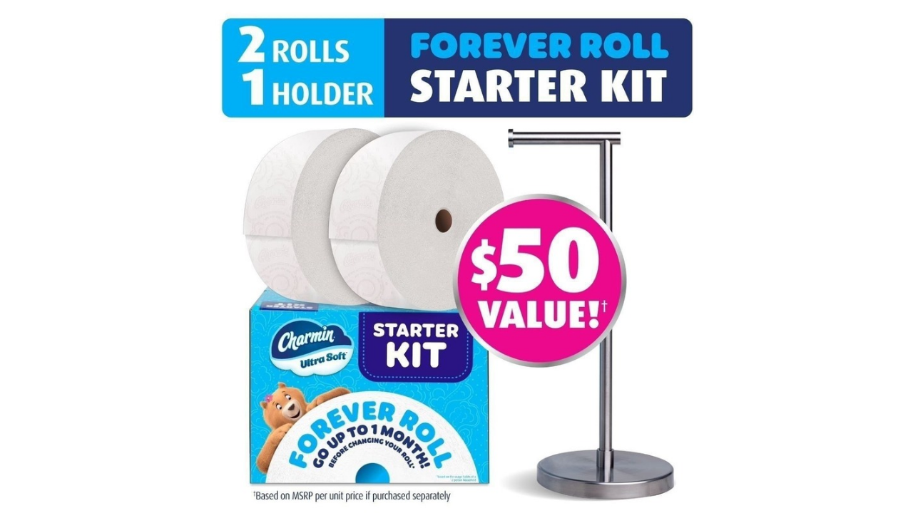 STARTER KIT: Pack contains 1 premium brushed stainless steel roll holder and 2 Charmin Ultra Soft Forever Rolls of toilet paper