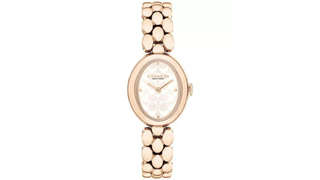 Designed with a modern minimalist sensibility, the Sammy is a refined timepiece perfect for every day. This sleek carnation gold tone bracelet watch features a silver white Coach Signature dial detailed with polished markers. Style 14504418