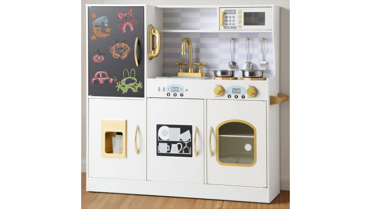love cooking and want to prepare a feast for the whole family. This wooden toy kitchen comes with everything the little chef needs, including a twist-button realistic stove top burner and faucet, ice cube maker, oven with window, cabinets, spice rack, telephone, 5-piece utensils, microwave, Sink, blackboard, and towel rail. This kid’s kitchen play set encourages creative thinking and storytelling, and your kids will be fascinated as they cook up a storm. Plus, thanks to its durable wood construction, this cocina de juguete will provide years of imaginative play.