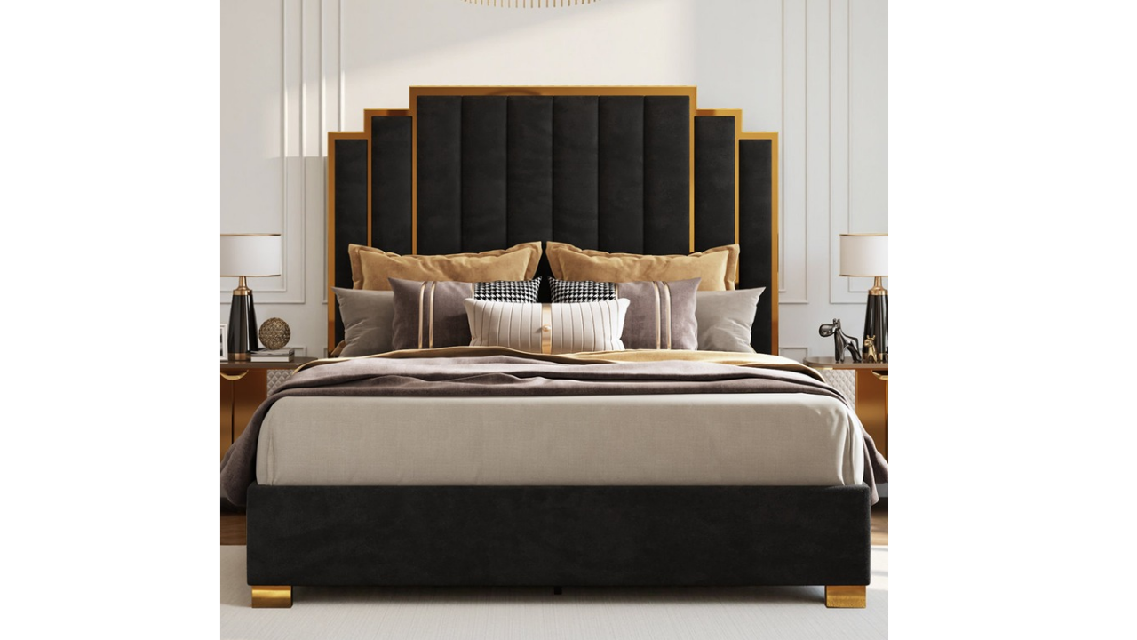 This upholstered platform bed blends glam style and comfort, creating a luxurious retreat in your bedroom. The stainless steel frame showcases a stepped headboard with a gold finish, offering a nod to Art Deco elegance. Wrapped in velvet and filled with foam, the headboard and footboard rest on block legs. The bed’s 12 manufactured wood slats and center support legs eliminate the need for a box spring and support most mattresses. We love that the gold metal plating on the headboard and legs creates a striking focal point, while the velvet side rails enhance the plush, contemporary look.
