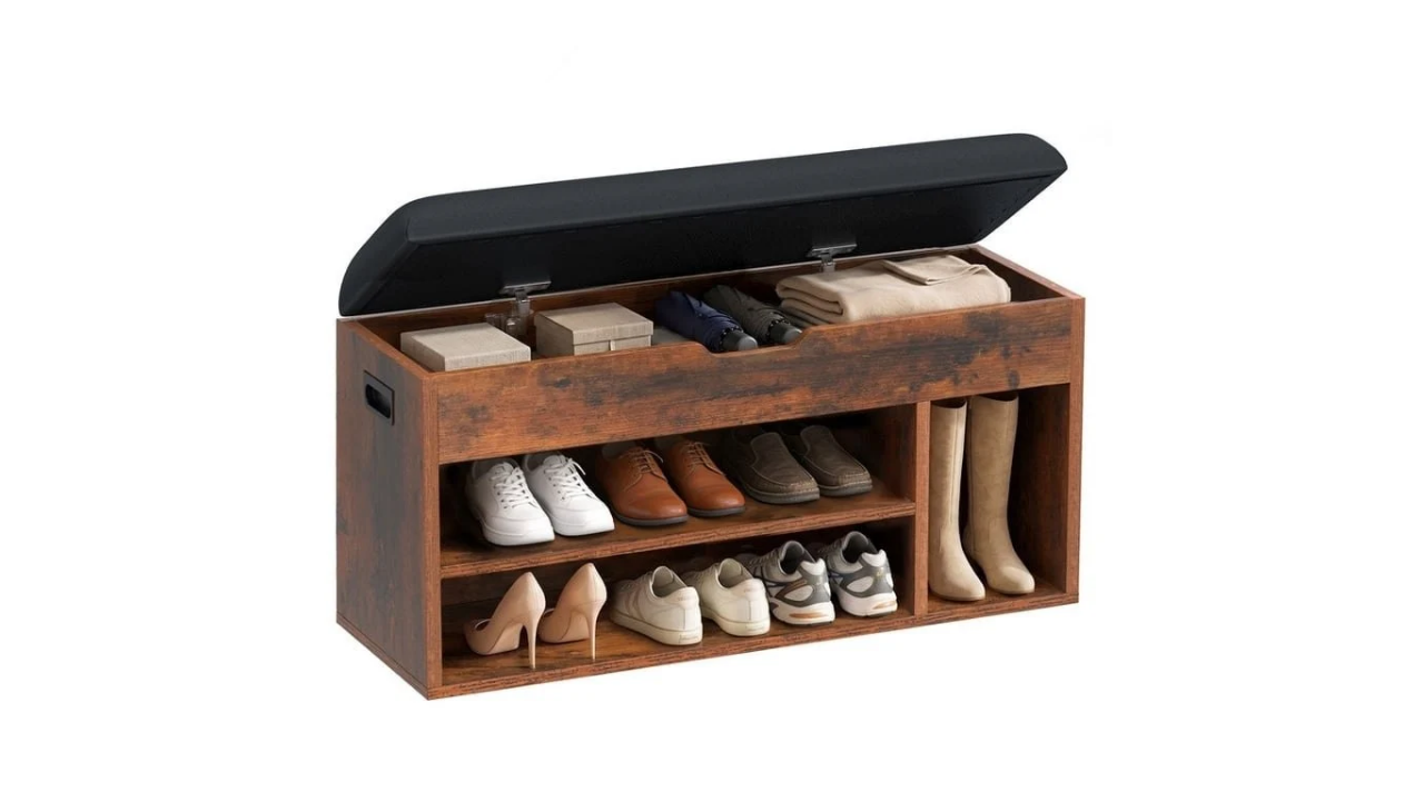 [Lift-Top Hidden Storage] The convenient lift-up seat with soft-close mechanism reveals a secret compartment for storing small items like umbrellas, scarves, or out-of-season accessories, keeping your space tidy.
