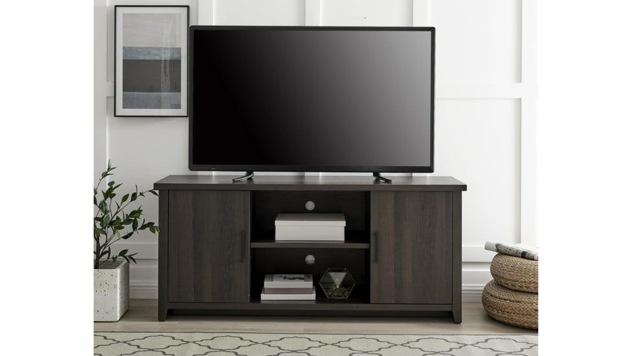 Mainstays TV Stand for TV’s up to 65″, Espresso The modern look and clean lines make this TV stand fit well with any decor. From gaming consoles and accessories, to components for your television, speakers, dvd’s and blu-rays, even board games and books, this versatile furniture is sure to keep you room clutter free. Accommodates most flat panel TVs up to 65″ and 135 lbs. Easy assembly