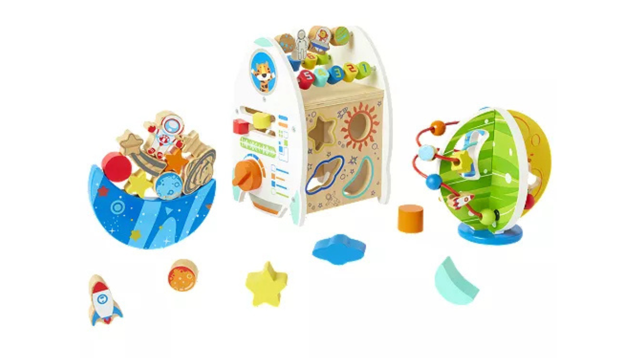 Embark on an intergalactic adventure with our, out of this World Trio Blast off into a world of discovery with our Rocket Activity Cube, featuring four colorful blocks filled with engaging activities to stimulate young minds. Navigate the stars with our Planet Bead Maze, where little astronauts can guide colorful beads through the twists and turns of space. And that’s not all – our Space Balancer, complete with ten blocks for endless stacking fun. Watch as young learners experiment with balance and gravity, discovering the secrets of space one block at a time. With our, out of this World Trio, the universe is yours to explore. Spark curiosity, inspire creativity, and launch into a world of endless fun and discovery
